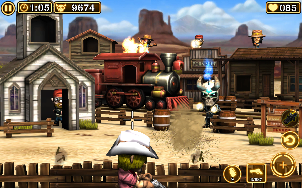 -Antes da compra de armas, o jogador pode testá-los em campo de tiro com alvos móveis, latas e garrafas.